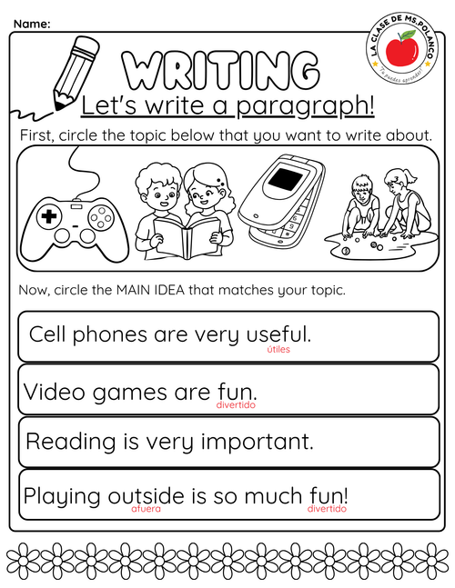 Bilingual Paragraph Writing Worksheet PDF | Main Idea and Supporting Details | Elementary Writing Practice | English Spanish Writing Activity for Kids